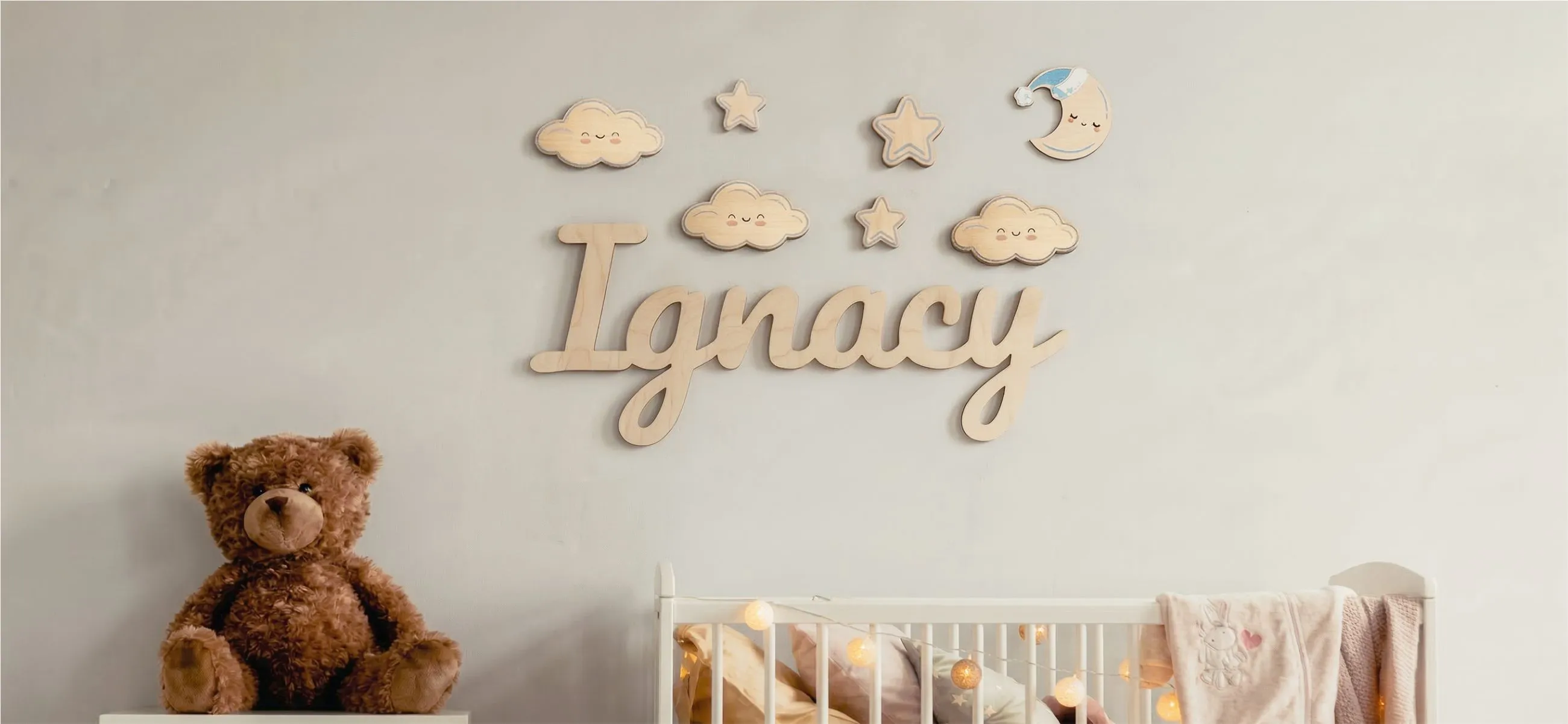 🌟 Stwórz magiczną przestrzeń dzięki drewnianym detalom dekoracyjnym! Jeśli wybierasz dla swojego dziecka drewniane imię, możesz jeszcze łatwiej dopełnić całej aranżacji dzięki naszym uroczym, dopasowanym dodatkom. Przygotowaliśmy drewniane chmurki, gwiazdki, księżyce i spadające gwiazdki, które perfekcyjnie komponują się z imieniem – zarówno pod względem grubości, jak i stylu. 🎨 Piękne kolory i grafiki, które ożywią ścianęDostępne w dwóch paletach:• błękity i odcienie niebieskiego – idealne do pokoju chłopięcego,• róże w różnych tonach – stworzone z myślą o dziewczęcych aranżacjach. Każdy kształt ozdobiony jest drukowaną grafiką, dzięki czemu wygląda jak mała ilustracja zawieszona na ścianie. Te detale dodają pokoikowi charakteru, a całość wygląda jak wyjątkowa, bajkowa kompozycja stworzona tylko dla Twojego dziecka. ✨ Kompozycja, która robi wrażenieZawieś chmurki nad imieniem, dodaj gwiazdki po bokach lub ułóż księżyc tuż obok – możliwości jest mnóstwo! Razem tworzą zestaw, który zamienia zwykłą ścianę w piękną, spersonalizowaną dekorację. Uzupełnij imię o te drobne detale i spraw, by przestrzeń malucha była jeszcze bardziej magiczna i wyjątkowa. 🌙✨