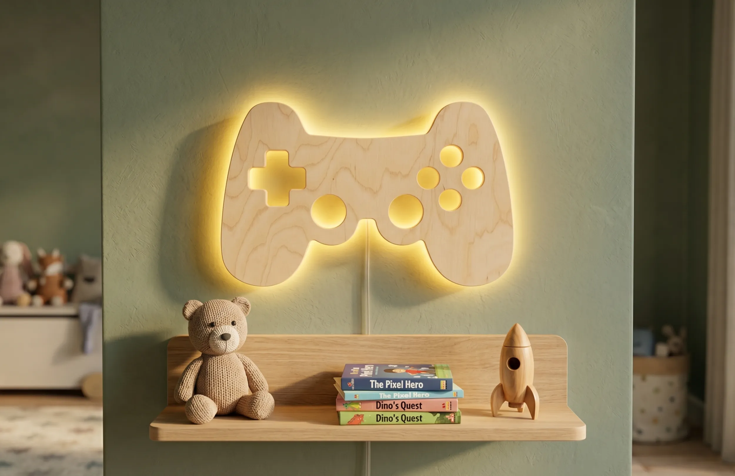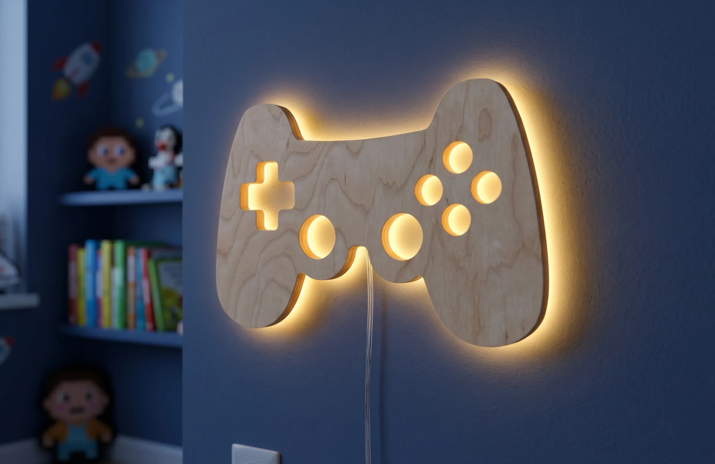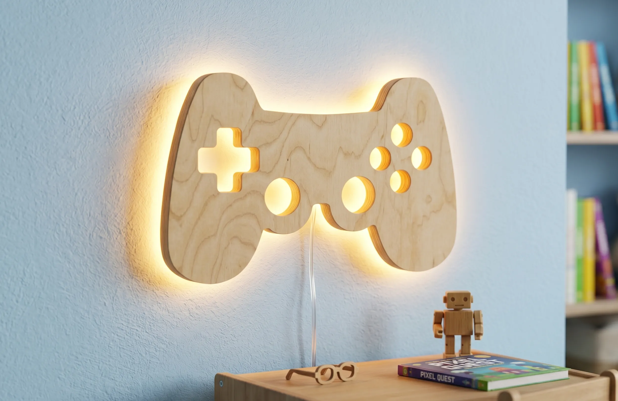 Szukasz elementu, który nada Twojemu stanowisku niepowtarzalny charakter? Nasz podświetlany pad LED to dekoracja stworzona z myślą o prawdziwych entuzjastach gier wideo. Wycięty z precyzją z wysokiej jakości naturalnej sklejki, odwzorowuje kształt kultowego kontrolera, łącząc nowoczesną pasję z klasycznym, ekologicznym materiałem.