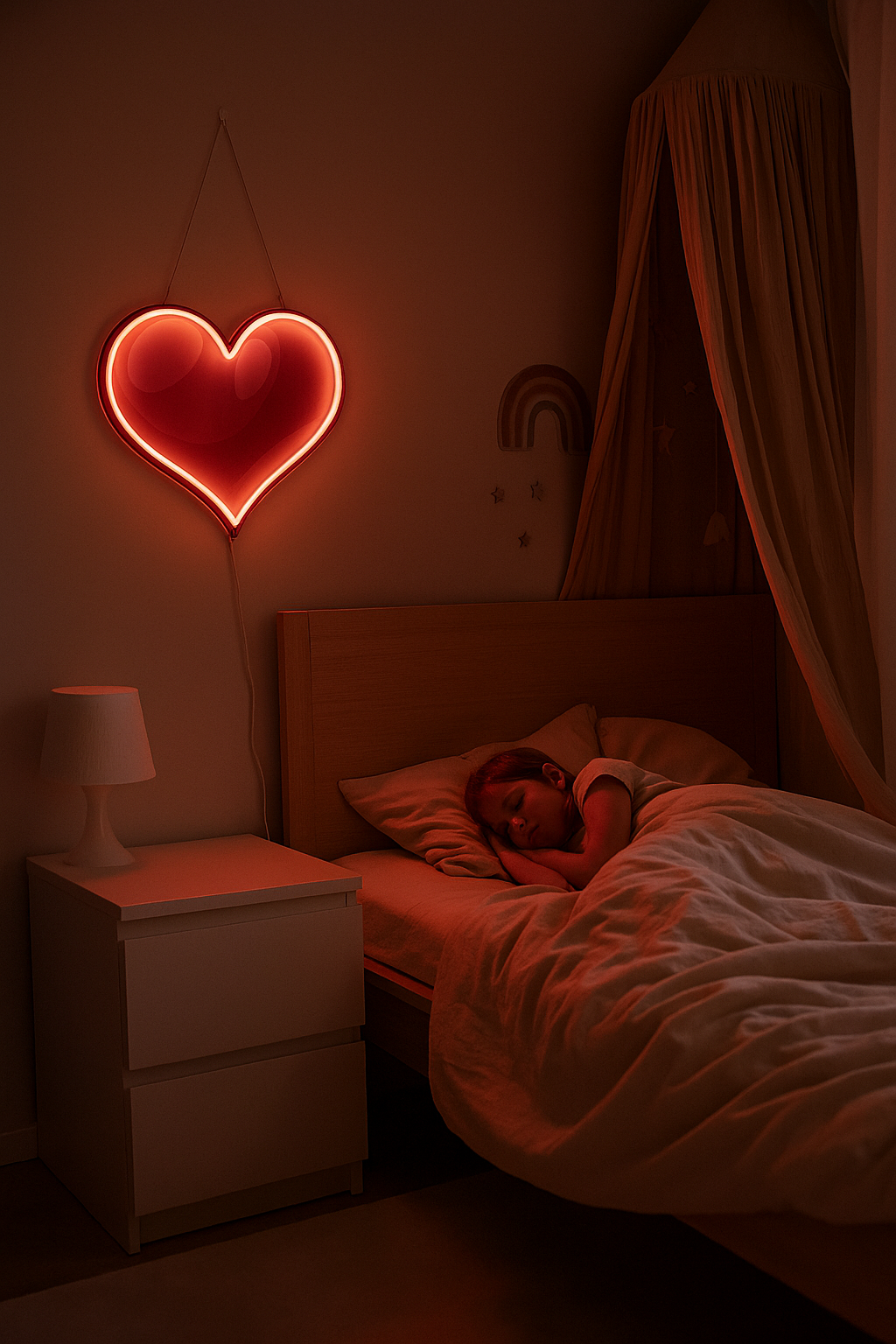 Ciepłe, czerwone światło LED wprowadza romantyczny i spokojny nastrój, idealny do zasypiania lub wieczornego relaksu.