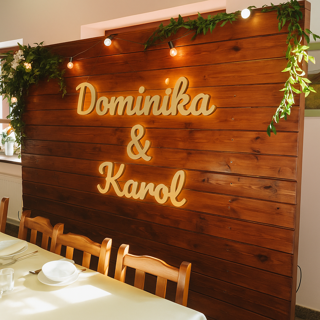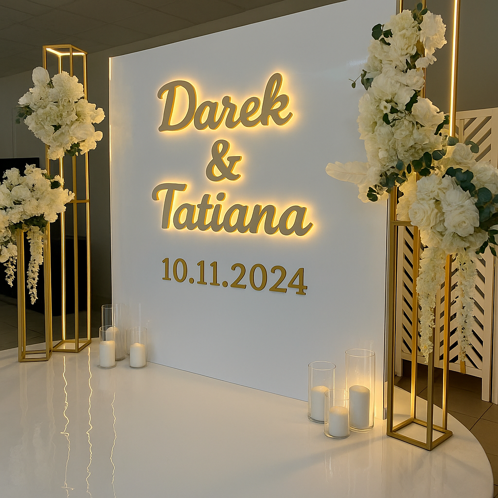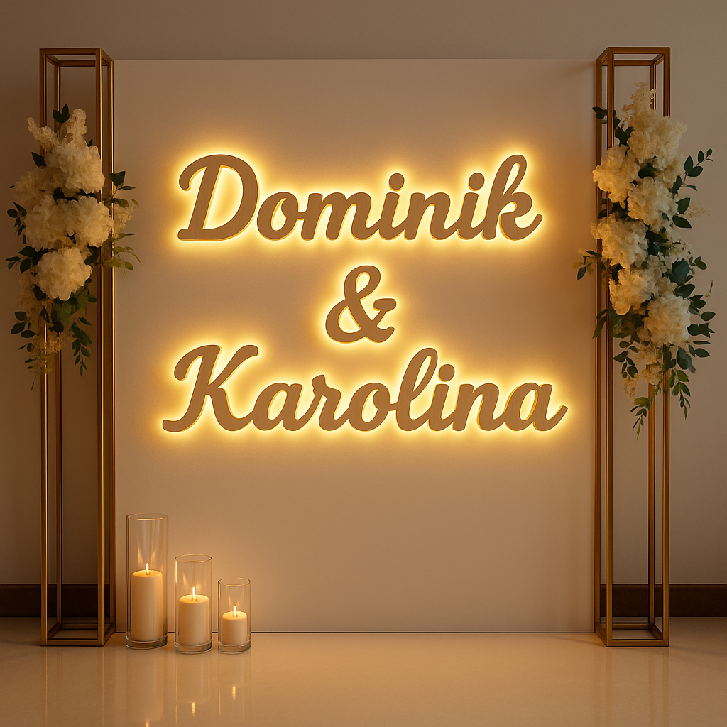 Stwórz niezapomniany klimat na swoim weselu dzięki personalizowanej dekoracji – podświetlanemu napisowi LED z Waszymi imionami lub inicjałami.