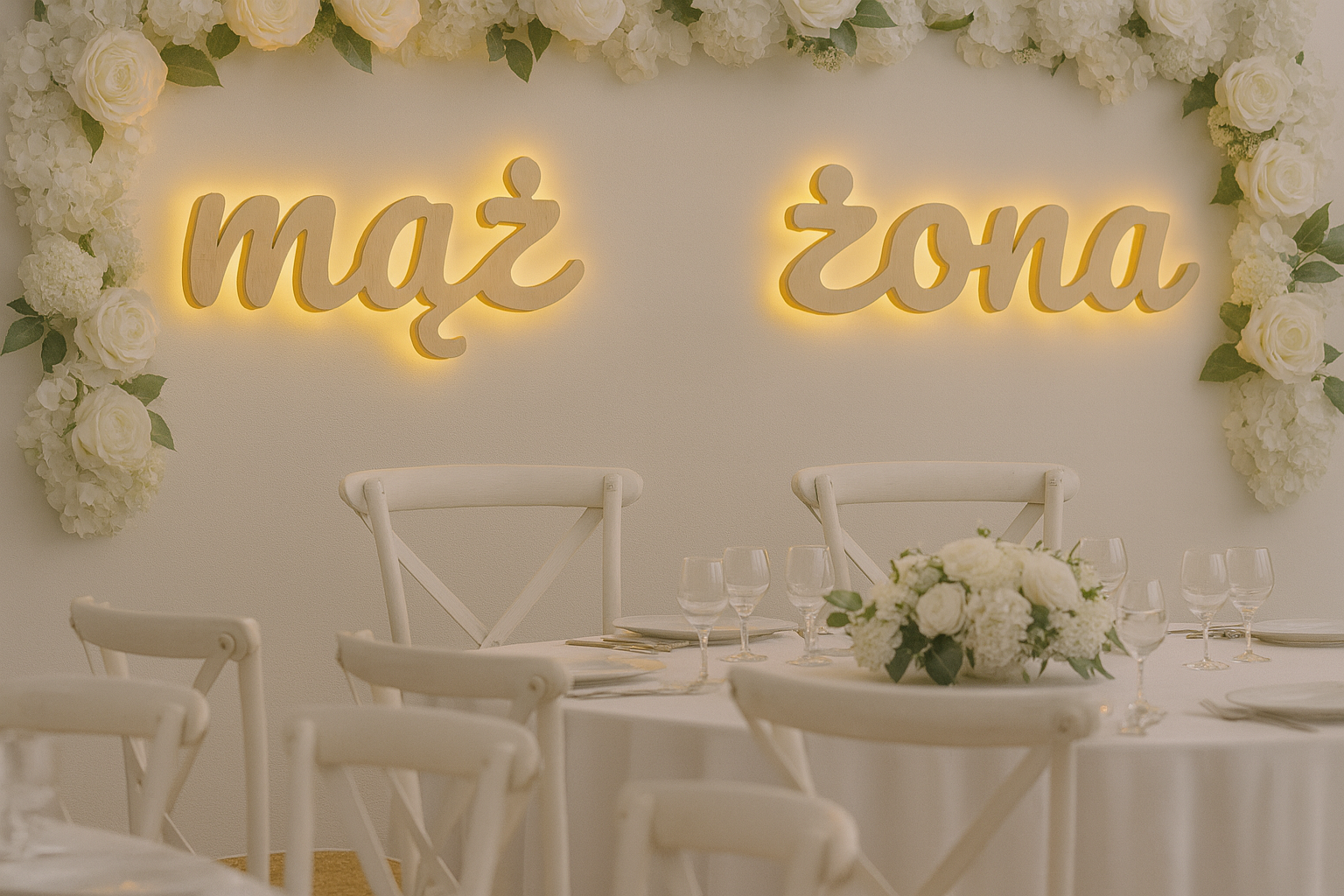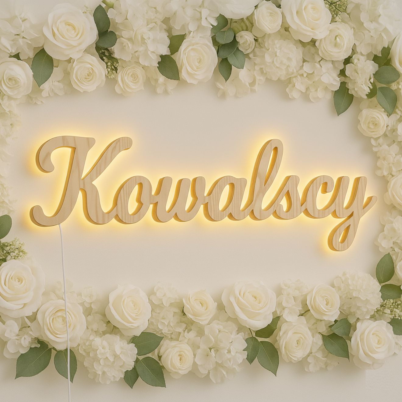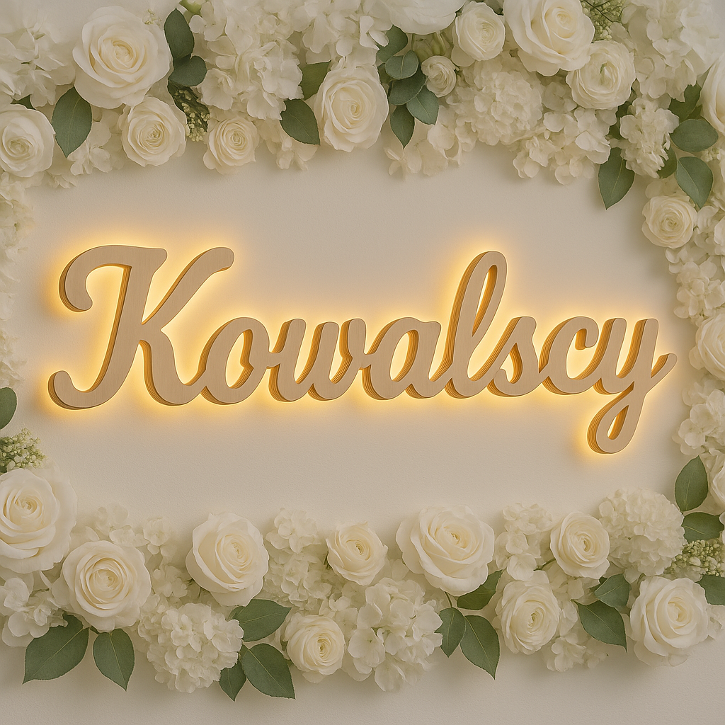 Stwórz niezapomniany klimat na swoim weselu dzięki personalizowanej dekoracji – podświetlanemu napisowi LED z Waszymi imionami lub inicjałami.
